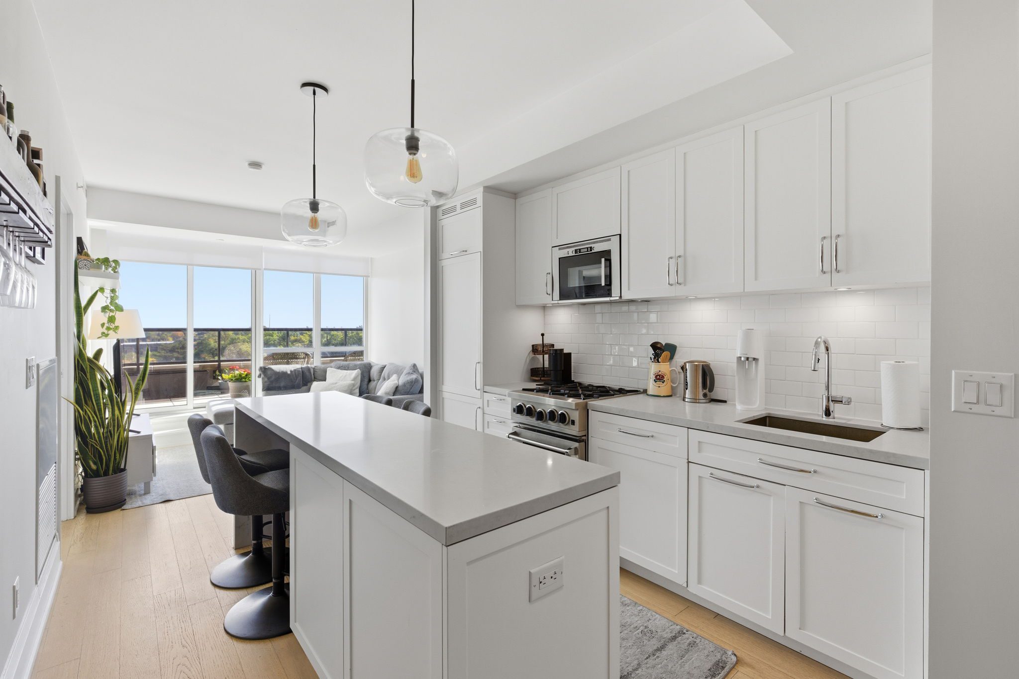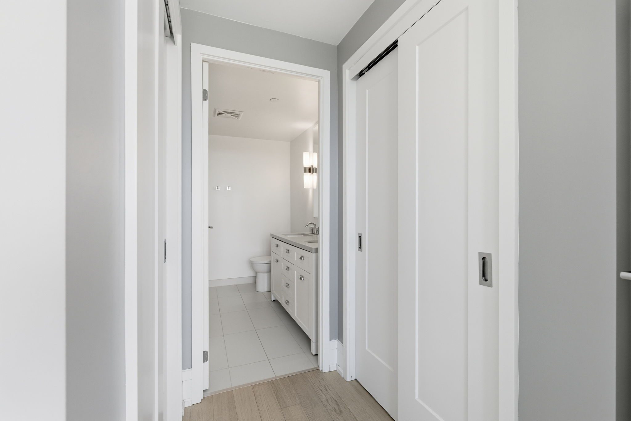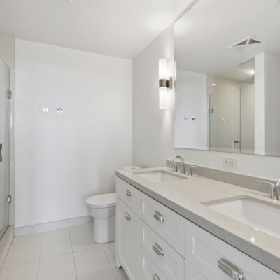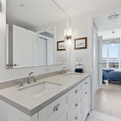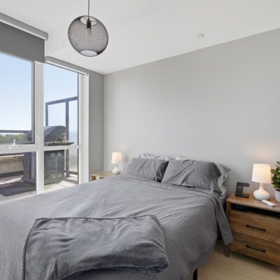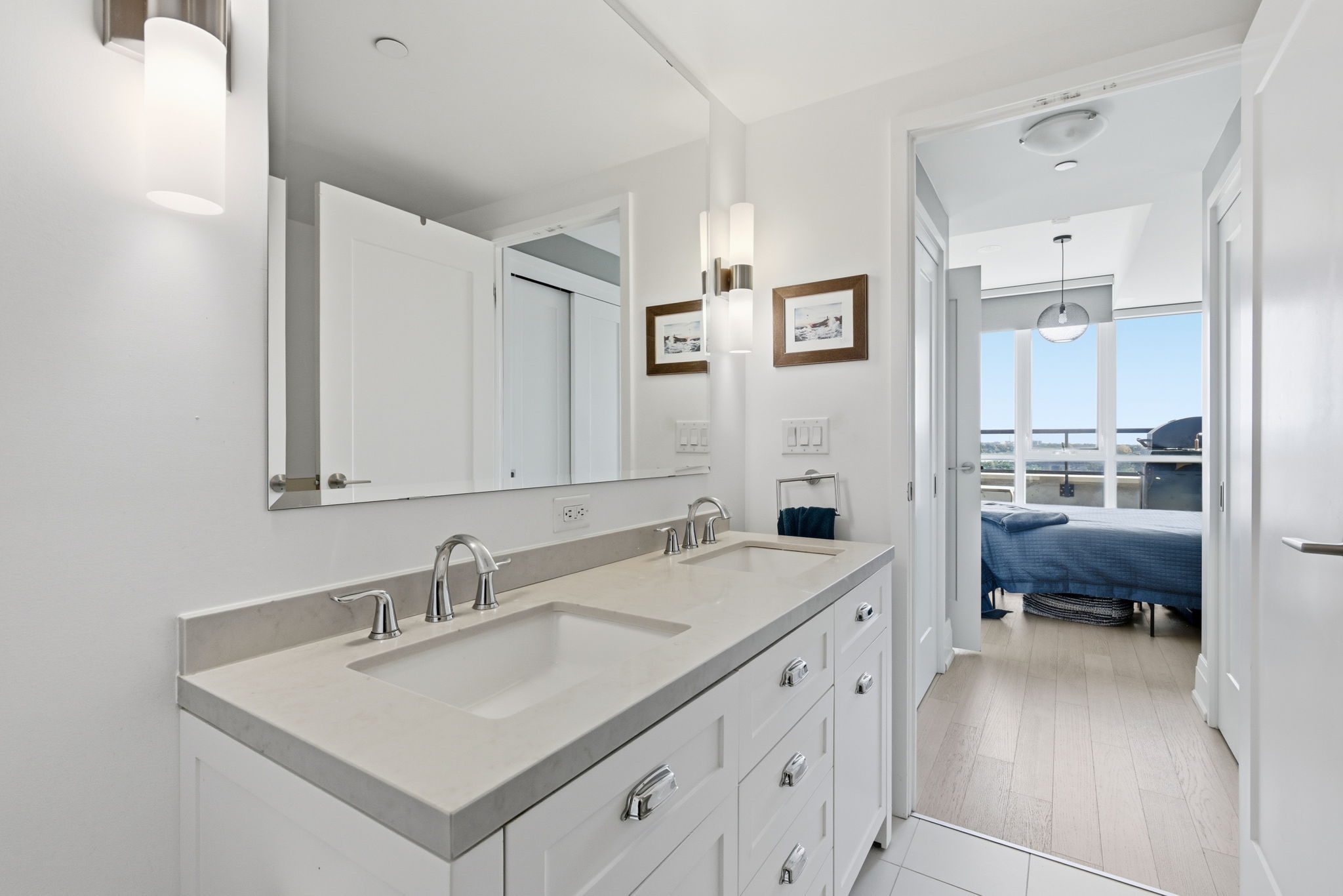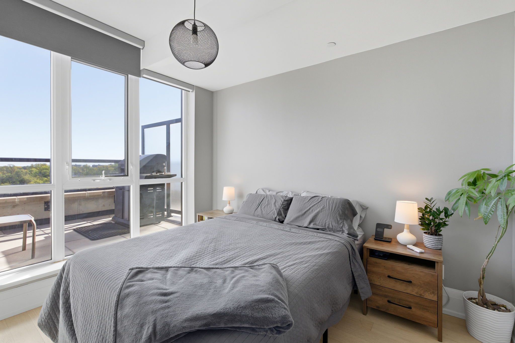This bright and spacious split bedroom unit features an open-concept layout with floor-to-ceiling windows that flood the space with natural light. It has 9-foot ceilings and engineered hardwood floors. The modern kitchen is equipped with sleek cabinetry, beautiful quartz countertops, premium appliances, and a large island perfect for entertaining. The living area opens to a private 220 sq ft balcony with unobstructed south-facing views, ideal for relaxing or enjoying morning coffee. With generous bedroom space, ample storage, and high-end finishes throughout, this unit is a perfect blend of style and functionality.