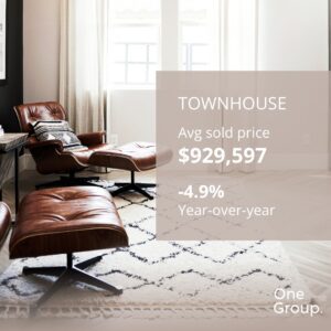 👉 Townhome sales received the most significant boost of 39.2% (9.4%). The average price of $929,597 ($915,511) is down by 4.9% (1%).
